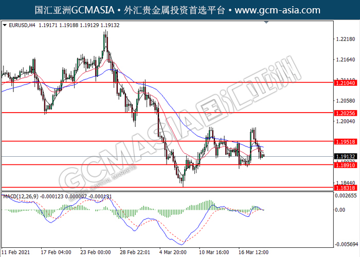20210319 EURUSD by willy | Mar 18, 2021 | 欧元兑美元 | 0 comments GCMAsia - EURUSD EURUSD 2021-03-19 EURUSD,H4:欧美突破后持续下行。MACD多头动能略减,短期可关注空头趋势。上方关注1.1950压力和1.2025压力,下方关注1.1890支撑和1.1830支撑。