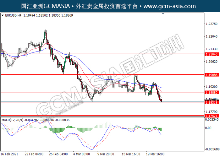 20210324 EURUSD by willy | Mar 24, 2021 | 欧元兑美元 | 0 comments GCMAsia - EURUSD EURUSD 2021-03-24 EURUSD,H4:欧美突破后持续下行。MACD空头动能转弱,短期可关注空头趋势。上方关注1.1890压力和1.1990压力,下方关注1.1830支撑和1.1755支撑。