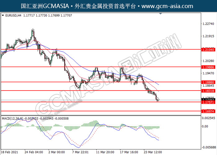 EURUSD,H4:欧美突破后持续下行,目前测试着支撑位。MACD空头动能偏强,若突破可关注空头趋势。上方关注1.1830压力和1.1890压力,下方关注1.1755支撑和1.1695支撑。