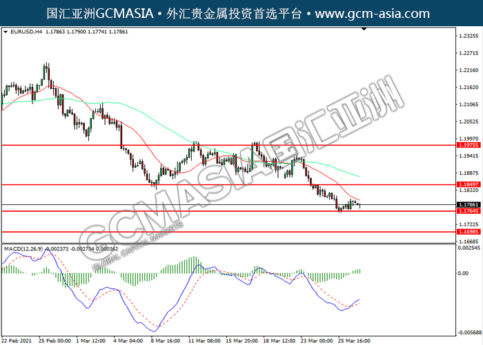 EURUSD,H4:欧美震荡下行,目前测试前期压力。然而,MACD多头动能略增,短期可关注技术性回调为主。上方关注1.1850压力和1.1975压力,下方关注1.1765支撑和1.1700支撑。