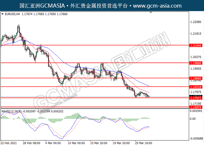 EURUSD,H4:欧美高位承压后回落,目前测试着支撑位。MACD多头动能略减,若突破可关注空头趋势。上方关注1.1830压力和1.1890压力,下方关注1.1755支撑和1.1695支撑。