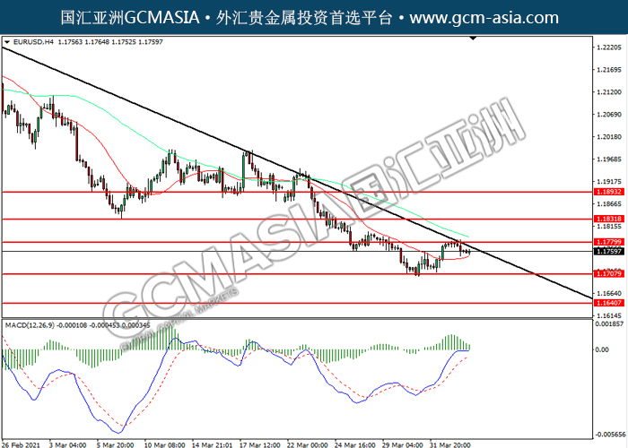 20210405 EURUSD by willy | Apr 5, 2021 | 欧元兑美元 | 0 comments GCMAsia-EURUSD EURUSD 2021-04-05 EURUSD,H4:欧美震荡下行。MACD多头动能略减,短期可关注空头为主。上方关注1.1780压力和1.1830压力,下方关注1.1710支撑和1.1640支撑。
