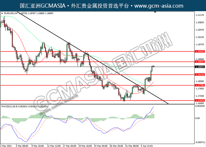 EURUSD,H4:欧美突破前期压力,震荡上行。然而,MACD多头动能略减,短期可关注技术性回调为主。上方关注1.1895压力和1.1945压力,下方关注1.1830支撑和1.1780支撑。