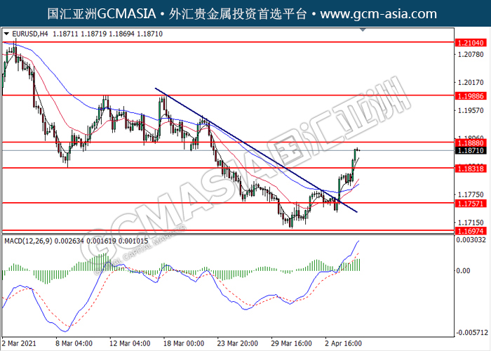 20210407 EURUSD by willy | Apr 6, 2021 | 欧元兑美元 | 0 comments GCMAsia - EURUSD EURUSD 2021-04-07 EURUSD,H4:欧美突破后持续上行。MACD多头动能略增,短期可关注多头趋势。上方关注1.1880压力和1.1990压力,下方关注1.1830支撑和1.1755支撑。