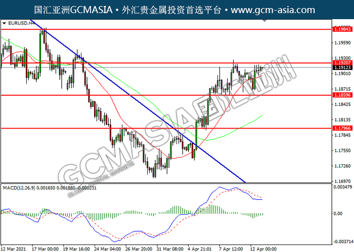 EURUSD,H4:欧美震荡上行,目前测试前期压力。MACD空头动能略减,若突破可关注多头为主。上方关注1.1920压力和1.1985压力,下方关注1.1860支撑和1.1795支撑。