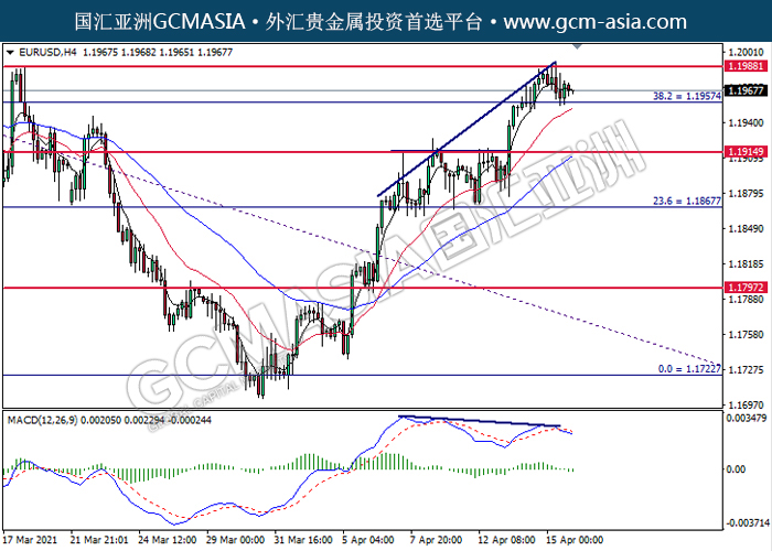EURUSD,H4:欧美高位承压后回落,目前测试着支撑位。MACD空头动能偏强,短期可关注空头趋势。上方关注1.1990压力和1.2030压力,下方关注1.1955支撑和1.1915支撑。