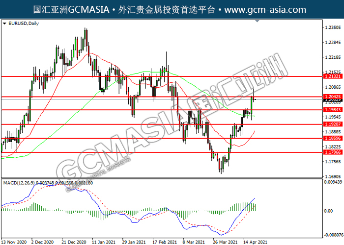 EURUSD,Daily: 欧美震荡上行,目前测试前期压力。然而,MACD多头动能略减,短期可关注技术性回调为主。上方关注1.2045压力和1.2130压力,下方关注1.1985支撑和1.1920支撑。