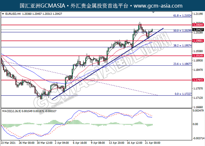 20210422 EURUSD-午间 by keyk | Apr 22, 2021 | 欧元兑美元 | 0 comments GCMAsia-EURUSD EURUSD 2021-04-22 EURUSD,H4:欧美突破后持续上行。MACD空头动能略减,短期可关注多头趋势。上方关注1.2060压力和1.2100压力,下方关注1.2030支撑和1.1990支撑。