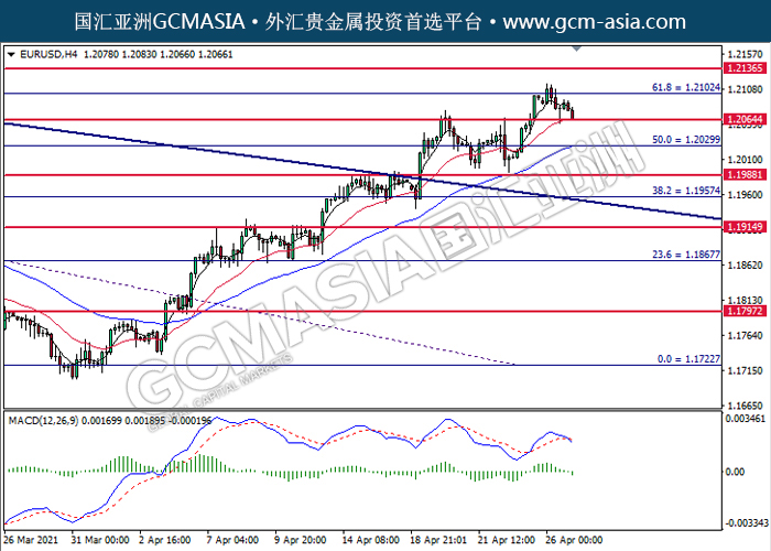 EURUSD,H4:欧美高位承压后回落,目前测试着支撑位。MACD空头动能略增,若突破可关注空头趋势。上方关注1.2100压力和1.2135压力,下方关注1.2065支撑和1.2030支撑。