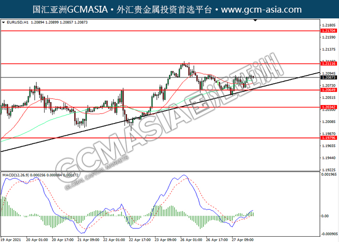20210428 EURUSD by willy | Apr 27, 2021 | 欧元兑美元 | 0 comments GCMAsia-EURUSD EURUSD 2021-04-28 EURUSD,H4: 欧美震荡上行。然而,MACD多头动能略减,短期可关注技术性回调为主。上方关注1.2110压力和1.2170压力,下方关注1.2065支撑和1.2035支撑。