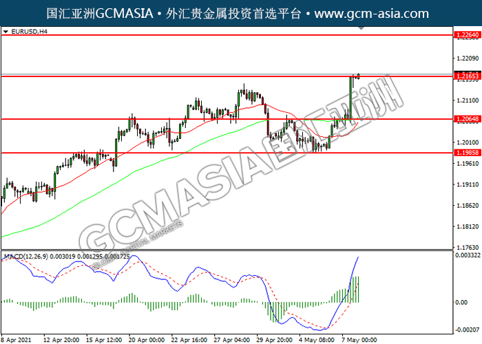EURUSD,H4: 欧美震荡上行,目前测试前期压力。MACD多头动能略增,若突破可关注多头为主。上方关注1.2165压力和1.2265压力,下方关注1.2065支撑和1.1985支撑。
