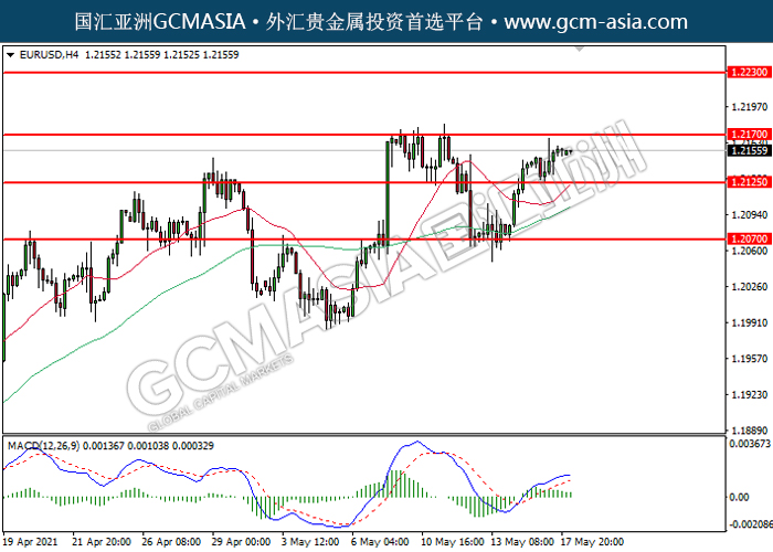 20210518 EURUSD by willy | May 18, 2021 | 欧元兑美元 | 0 comments EURUSD,H4: 欧美低位反弹。MACD已形成金叉,动能转强,短期可关注多头为主。上方关注1.2170压力和1.2230压力,下方关注1.2125支撑和1.2070支撑。