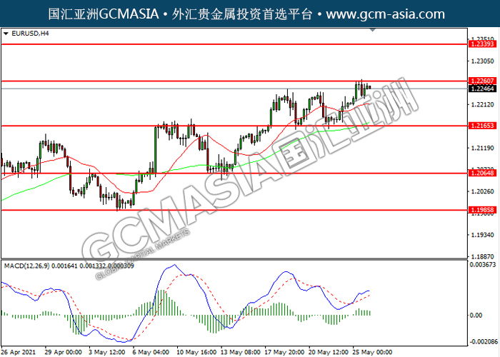 EURUSD,H4: 欧美震荡上行,目前测试前期压力。然而,MACD多头动能略减,短期可关注技术性回调为主。上方关注1.2260压力和1.2340压力,下方关注1.2165支撑和1.2065支撑。
