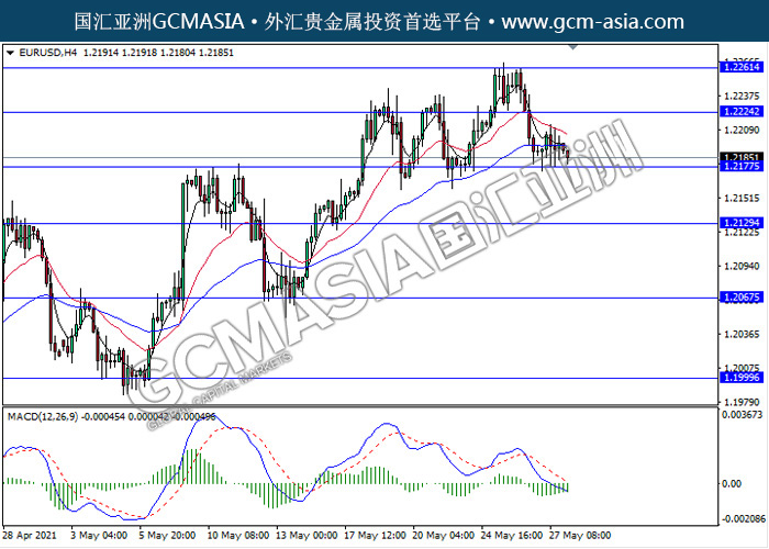 EURUSD,H4:欧美震荡下行,目前测试靠近前期支撑。然而,MACD空头动能有所略减,短期关注技术性多头反弹趋势为主。上方关注1.2225压力和1.2260压力,下方关注1.2175支撑和1.2130支撑。