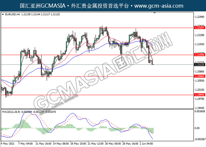 20210604 EURUSD-午间 by keyk | Jun 4, 2021 | 欧元兑美元 | 0 comments GCMAsia-EURUSD EURUSD 2021-06-04 EURUSD,H4: 欧美突破前期支撑,空头排列。MACD动能持续略减,中期继续看空为主。上方关注1.2150压力和1.2255压力,下方关注1.2065支撑和1.1995支撑。