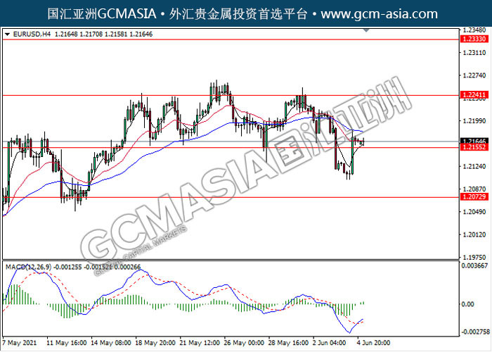 EURUSD,H4: 欧美突破前期压力,多头排列。MACD形成金叉,动能略略增,中期继续看多为主。上方关注1.2240压力和1.2335压力,下方关注1.2155支撑和1.2070支撑。