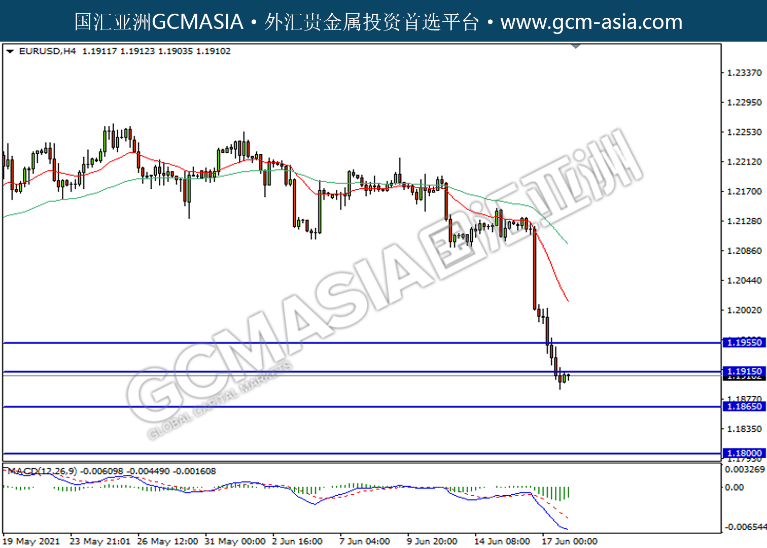 20210618-EURUSD by willy | Jun 18, 2021 | 欧元兑美元 | 0 comments EURUSD,H4: 欧美震荡下行。然而,MACD空头动能有所略减,短期关注技术性回调。上方关注1.1915压力和1.1955压力,下方关注1.1865支撑和1.1800支撑。