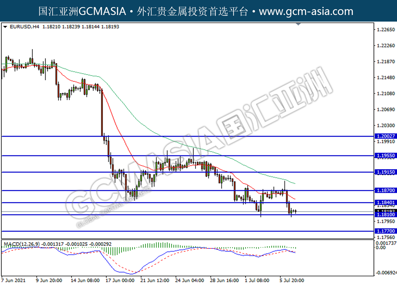 20210707 EURUSD-午间 by willy | Jul 7, 2021 | 欧元兑美元 | 0 comments EURUSD,H4: 欧美受承压回落。MACD已形成死叉,动能转弱,若下破可继续看空。上方关注1.1840压力和1.1870压力,下方关注1.1810支撑和1.1770支撑。