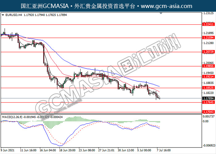 20210708 EURUSD-午间 by keyk | Jul 8, 2021 | 欧元兑美元 | 0 comments EURUSD,H4: 欧美空头排列,目前测试靠近前期支撑。MACD动能持续略减,若突破继续看空为主。上方关注1.1850压力和1.1920压力,下方关注1.1765支撑和1.1705支撑。