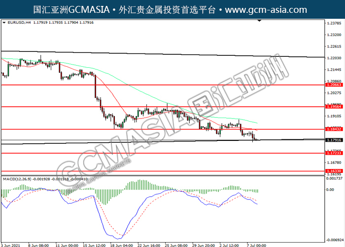 20210708 EURUSD by willy | Jul 8, 2021 | 欧元兑美元 | 0 comments EURUSD,H4: 欧美震荡下行。MACD空头动能略减,短期可关注空头为主。上方关注1.1845压力和1.1955压力,下方关注1.1725支撑和1.1635支撑。