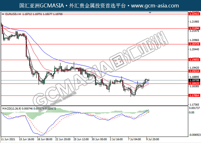 20210712 EURUSD-午间 by keyk | Jul 12, 2021 | 欧元兑美元 | 0 comments EURUSD,H4: 欧美突破前期压力,多头排列。MACD动能持续略增,短期继续看多为主。上方关注1.1920压力和1.1985压力,下方关注1.1850支撑和1.1785支撑。