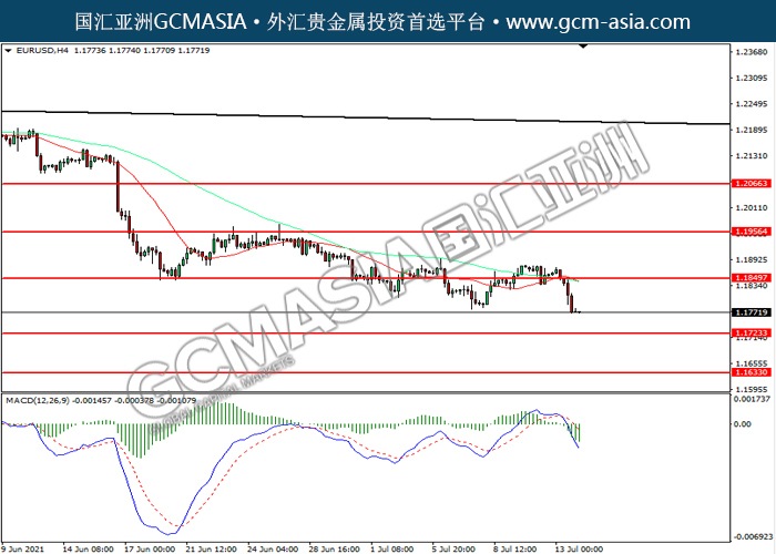 20210714 EURUSD by willy | Jul 14, 2021 | 欧元兑美元 | 0 comments EURUSD,H4: 欧美震荡下行。MACD空头动能略增,短期可关注空头为主。上方关注1.1850压力和1.1955压力,下方关注1.1725支撑和1.1635支撑。