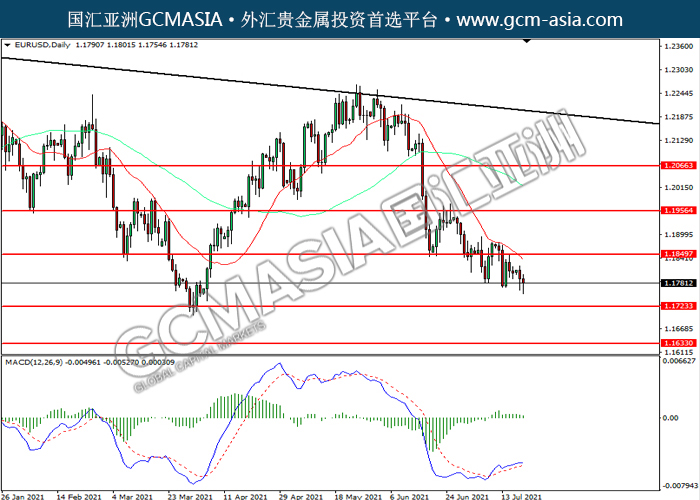 20210721 EURUSD by willy | Jul 21, 2021 | 欧元兑美元 | 0 comments EURUSD,Daily: 欧美震荡下行。MACD多头动能略减,短期关注空头为主。上方关注1.1850压力和1.1955压力,下方关注1.1725支撑和1.1635支撑。
