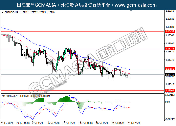 20210726 EURUSD-午间 by keyk | Jul 26, 2021 | 欧元兑美元 | 0 comments EURUSD,H4: 欧美近期突破前期支撑,震荡下行。然而,MACD形成金叉,动能略增,短期关注多头多头反弹趋势为主。上方关注1.1795压力和1.1880压力,下方关注1.1705支撑和1.1625支撑。