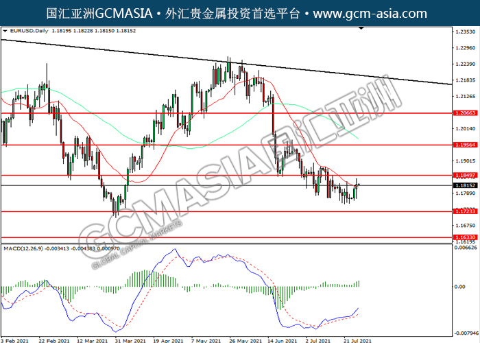20210728 EURUSD by willy | Jul 28, 2021 | 欧元兑美元 | 0 comments EURUSD,Daily: 欧美震荡上行,目前测试前期压力。MACD多头动能略增,若突破可关注多头为主。上方关注1.1850压力和1.1955压力,下方关注1.1725支撑和1.1635支撑。