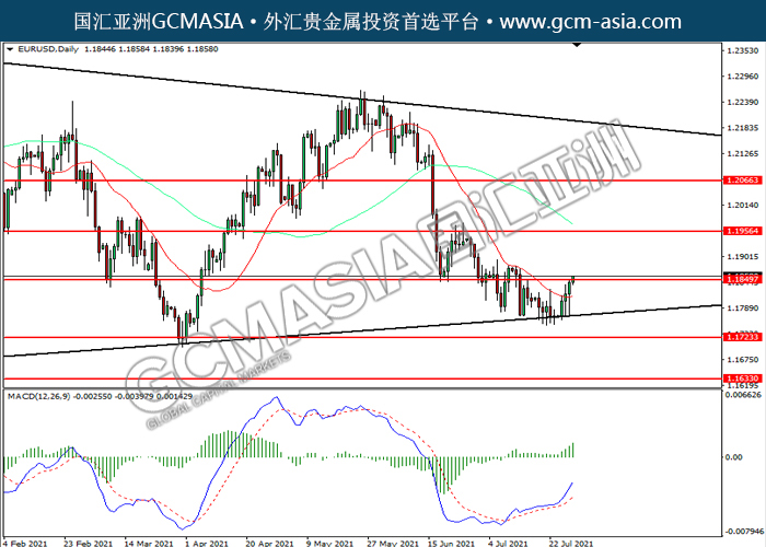 20210729 EURUSD-午间 by willy | Jul 29, 2021 | 欧元兑美元 | 0 comments EURUSD,Daily: 欧美震荡上行,目前测试前期压力。MACD多头动能略增,若突破可关注多头为主。上方关注1.1850压力和1.1955压力,下方关注1.1725支撑和1.1635支撑。