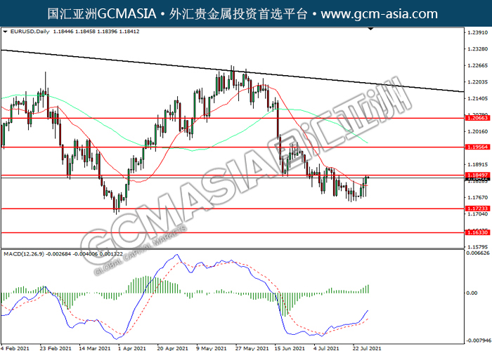 20210729 EURUSD by willy | Jul 29, 2021 | 欧元兑美元 | 0 comments EURUSD,Daily: 欧美震荡上行,目前测试前期压力。MACD多头动能略增,若突破可关注多头为主。上方关注1.1850压力和1.1955压力,下方关注1.1725支撑和1.1635支撑。
