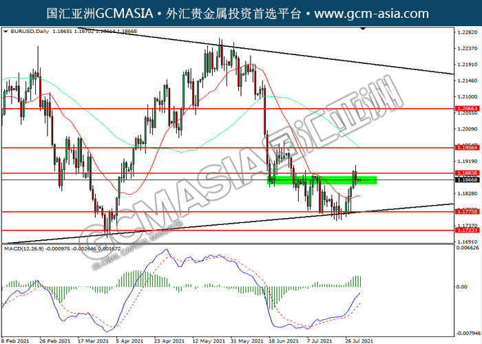 20210802 EURUSD by willy | Aug 2, 2021 | 欧元兑美元 | 0 comments EURUSD,Daily: 欧美震荡上行,目前测试前期压力。然而,MACD多头动能略减,短期可关注技术性回调为主。上方关注1.1885压力和1.1955压力,下方关注1.1775支撑和1.1725支撑。
