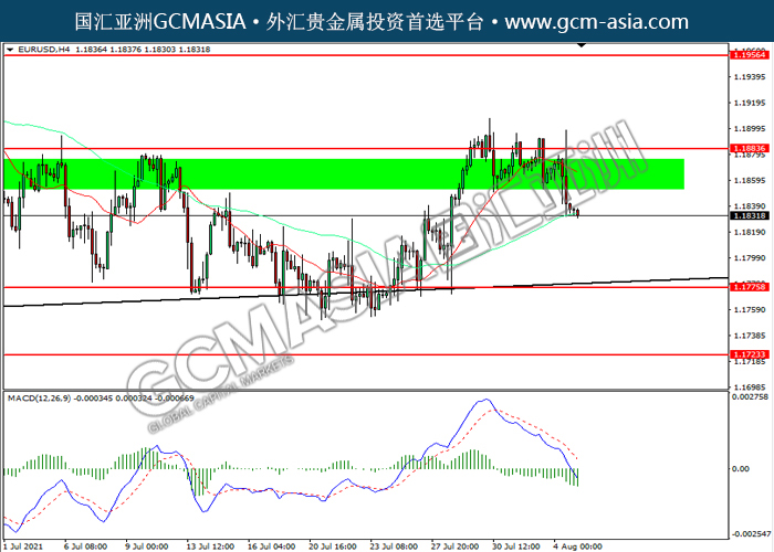 20210805 EURUSD by willy | Aug 5, 2021 | 欧元兑美元 | 0 comments EURUSD,H4: 欧美震荡下行。MACD空头动能略增,短期可关注空头为主。上方关注1.1885压力和1.1955压力,下方关注1.1775支撑和1.1725支撑。