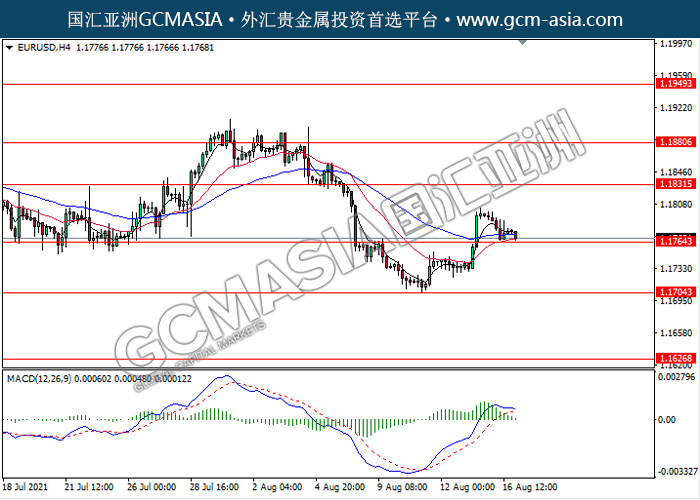 20210817 EURUSD-午间 by keyk | Aug 17, 2021 | 欧元兑美元 | 0 comments EURUSD,H4: 欧美高位承压回落,目前测试前期支撑。MACD多头动能略减,若突破可继续看空方向为主。上方关注1.1830压力和1.1880压力,下方关注1.1765支撑和1.1705支撑。