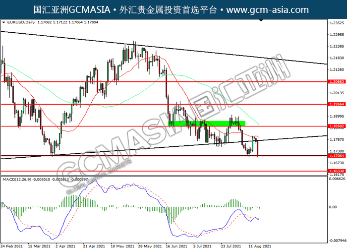 EURUSD,Daily: 欧美高位回落,目前测试前期支撑。MACD已形成死叉,动能转弱,若下破可关注空头为主。上方关注1.1850压力和1.1955压力,下方关注1.1705支撑和1.1635支撑。