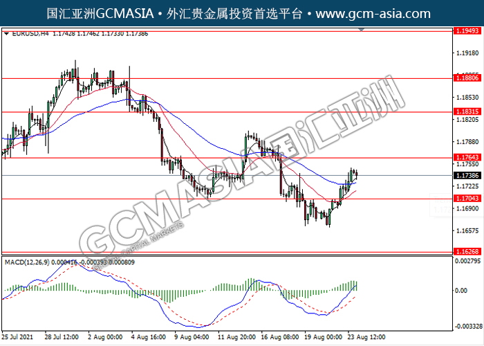20210824 EURUSD-午间 by keyk | Aug 24, 2021 | 欧元兑美元 | 0 comments EURUSD,H4: 欧美多头排列,目前测试靠近前期压力。然而,MACD多头动能略减,短期关注技术性空头回调为主。上方关注1.1765压力和1.1830压力,下方关注1.1705支撑和1.1625支撑。