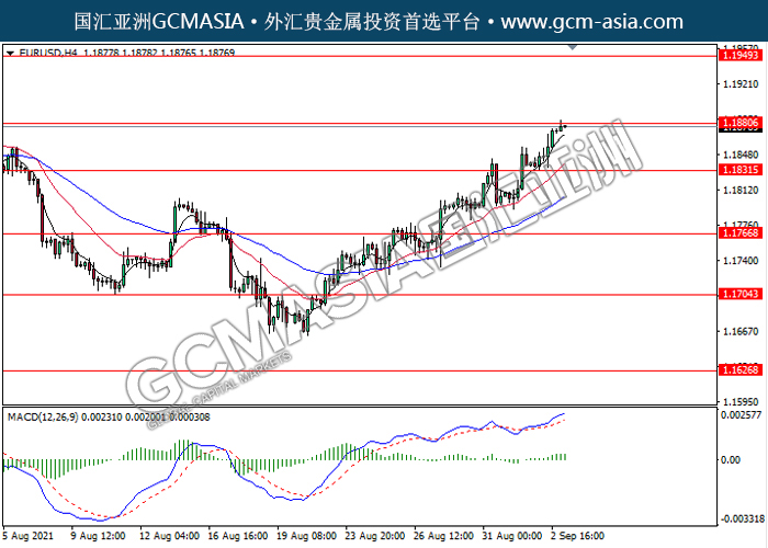 20210903 EURUSD-午间 by keyk | Sep 3, 2021 | 欧元兑美元 | 0 comments EURUSD,H4: 欧美多头排列,目前测试前期压力。MACD动能略增,若突破可继续看多为主。上方关注1.1880压力和1.1950压力,下方关注1.1830支撑和1.1765支撑。