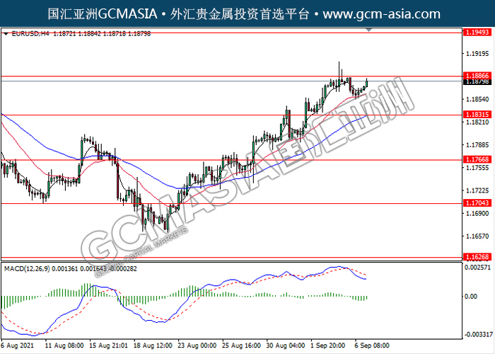 20210907 EURUSD-午间 by keyk | Sep 7, 2021 | 欧元兑美元 | 0 comments EURUSD,H4: 欧美震荡上行,目前测试前期压力。MACD形成金叉,空头动能略减,若突破可继续看多为主。上方关注1.1885压力和1.1950压力,下方关注1.1830支撑和1.1765支撑。