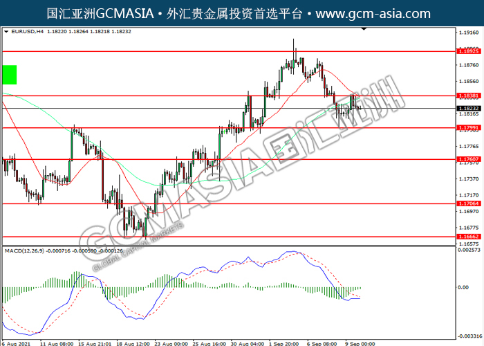 20210910 EURUSD by willy | Sep 10, 2021 | 欧元兑美元 | 0 comments EURUSD,H4: 欧美高位回落。然而,MACD空头动能略减,短期可关注技术性回调为主。上方关注1.1840压力和1.1895压力,下方关注1.1800支撑和1.1760支撑。
