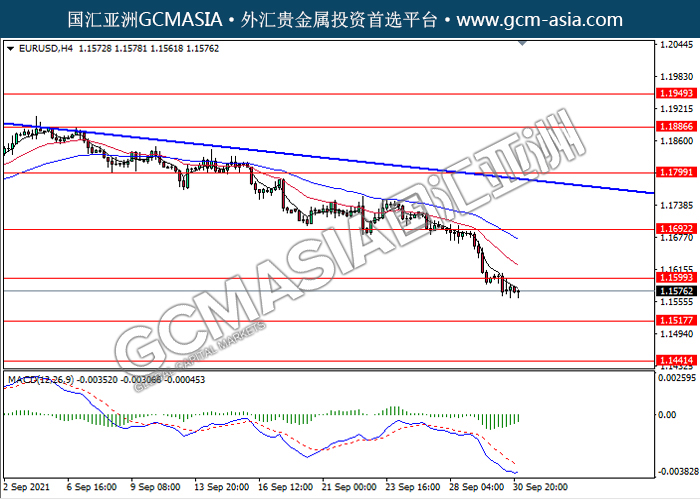 EURUSD,H4: 欧美突破前期支撑,震荡下行。然而,MACD空头动能略减,短期关注多头反弹为主。上方关注1.1600压力和1.1690压力,下方关注1.1515支撑和1.1440支撑。