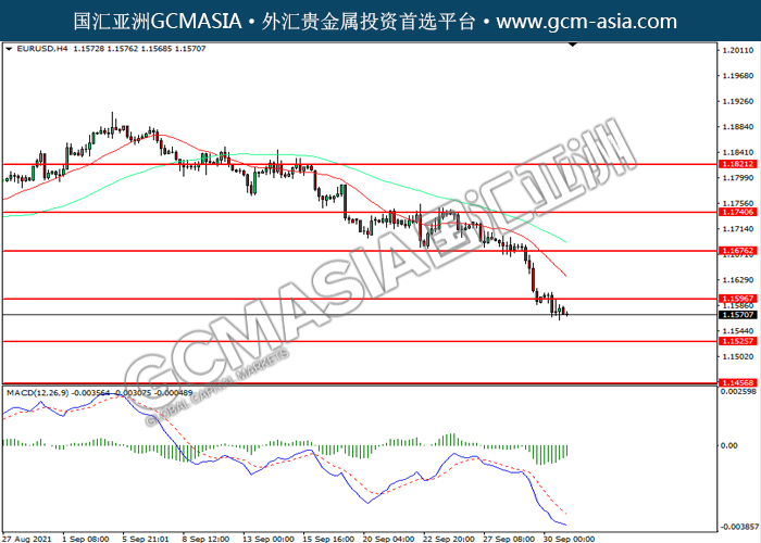 EURUSD,H4: 欧美下破前期支撑,震荡下行。然而,MACD空头动能略减,短期可关注技术性回调为主。上方关注1.1600压力和1.1675压力,下方关注1.1525支撑和1.1455支撑。