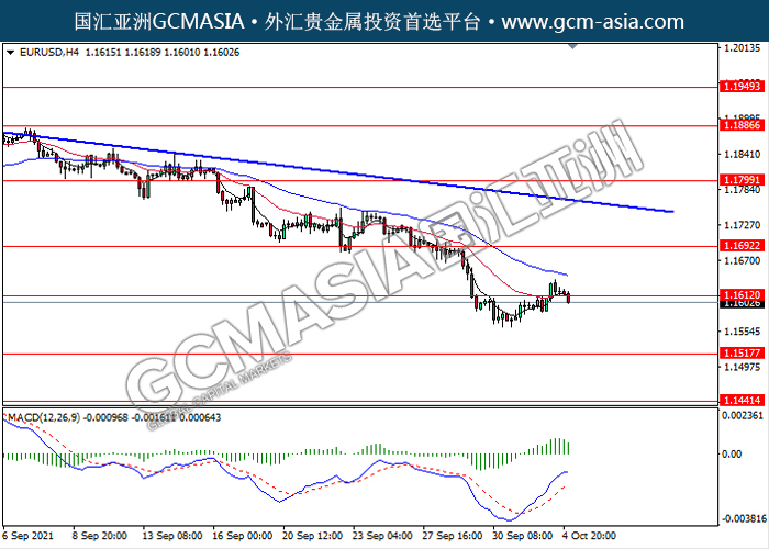 20211005 EURUSD-午间 by keyk | Oct 5, 2021 | 欧元兑美元 | 0 comments EURUSD,H4: 欧美高位承压回落然而,MACD多头动能略减,短期继续关注空头回调为主。上方关注1.1600压力和1.1690压力,下方关注1.1515支撑和1.1440支撑。