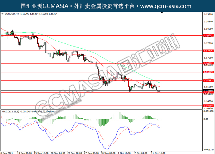 20211013 EURUSD by willy | Oct 13, 2021 | 欧元兑美元 | 0 comments EURUSD,H4: 欧美震荡下行。MACD多头动能略减,短期可关注空头为主。上方关注1.1585压力和1.1630压力,下方关注1.1525支撑和1.1455支撑。