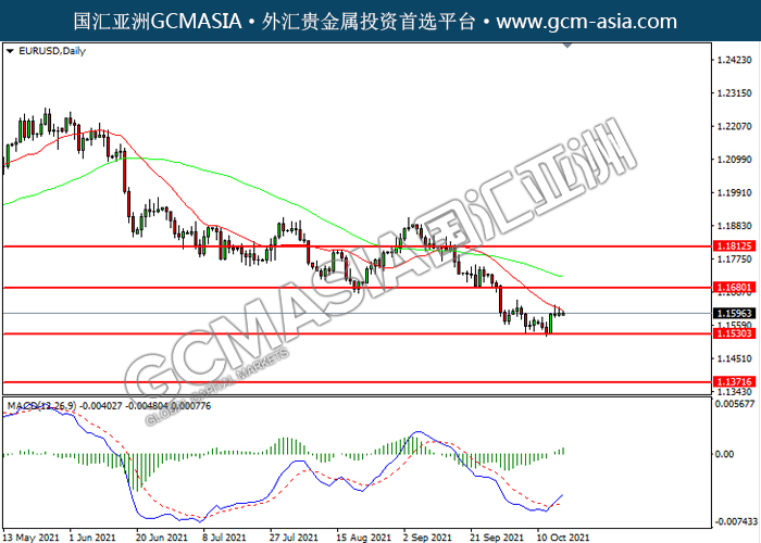 20211018 EURUSD by willy | Oct 18, 2021 | 欧元兑美元 | 0 comments EURUSD,Daily: 欧美震荡上行。MACD多头动能略曾,短期可关注多头为主。上方关注1.1680压力和1.1815压力,下方关注1.1530支撑和1.1370支撑。