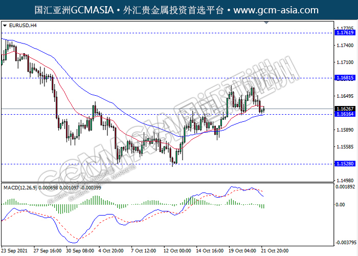 20211022 EURUSD-午间 by keyk | Oct 22, 2021 | 欧元兑美元 | 0 comments EURUSD,H4:欧美高位承压回落,目前测试前期支撑。MACD动能略减,若突破可继续关注空头方向为主。上方关注1.1680压力和1.1760压力,下方关注1.1615支撑和1.1530支撑。