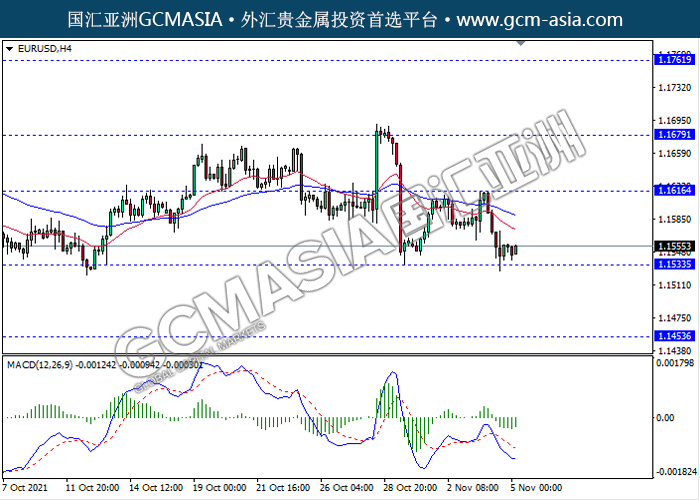 20211105 EURUSD-午间 by willy | Nov 5, 2021 | 欧元兑美元 | 0 comments EURUSD,H4:欧美空头排列,目前测试前期支撑。MACD形成死叉,动能略减,短期继续看空回调为主。上方关注1.1615压力和1.1680压力,下方关注1.1535支撑和1.1455支撑。