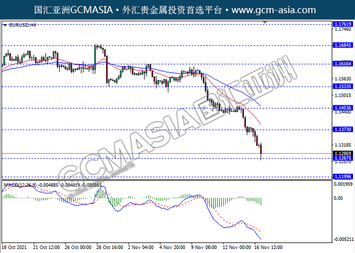 EURUSD,H4: 欧美空头排列,目前测试前期支撑。MACD动能持续略减,若突破可继续看空为主。上方关注1.1375压力和1.1455压力,下方关注1.1265支撑和1.1200支撑。