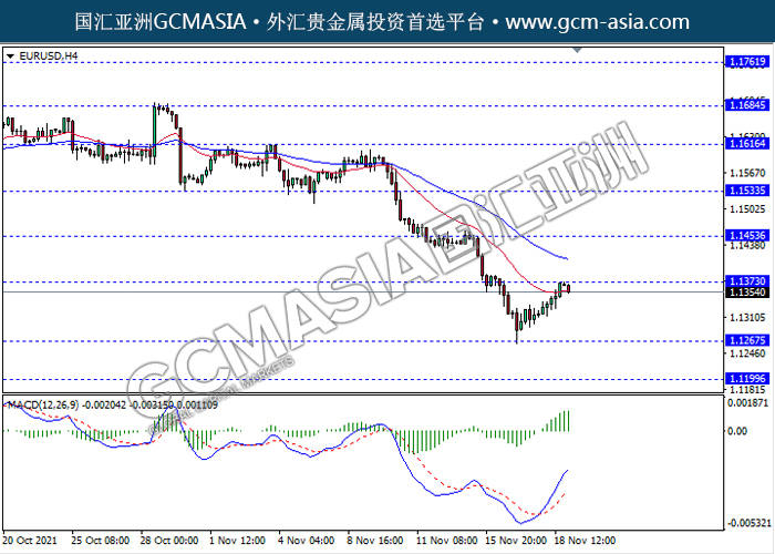 EURUSD,H4: 欧美触底反弹上行,目前测试前期压力。然而,MACD多头动能略减,短期关注技术性空头回调为主。上方关注1.1375压力和1.1455压力,下方关注1.1265支撑和1.1200支撑。