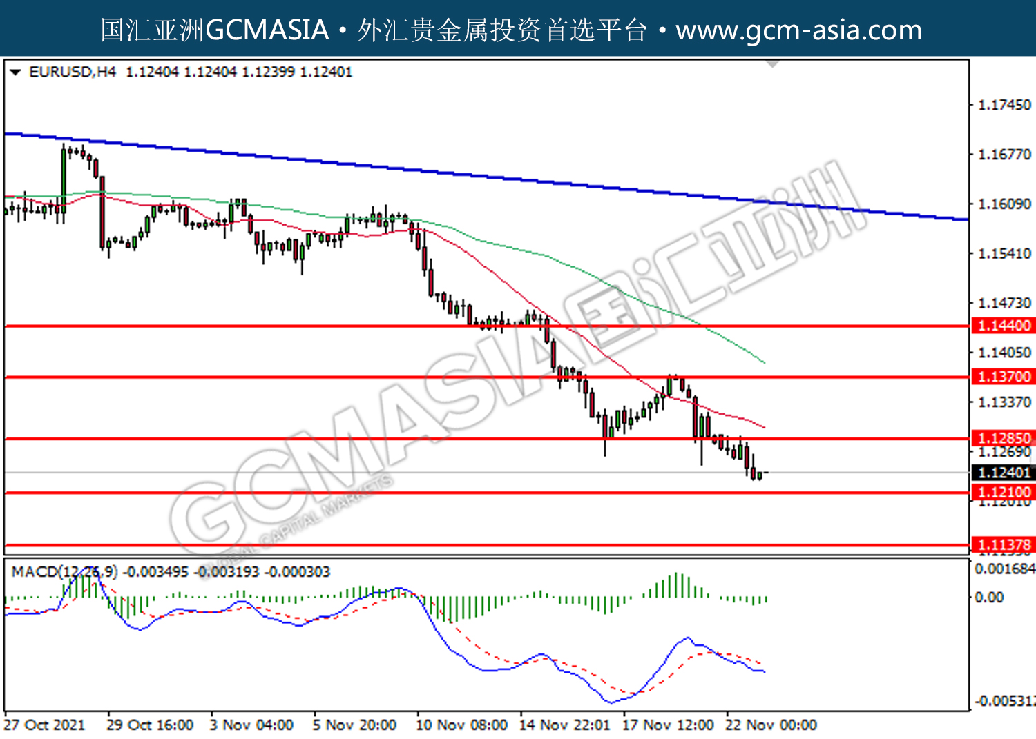 20211123 EURUSD by willy | Nov 23, 2021 | 欧元兑美元 | 0 comments EURUSD,H4:欧美震荡下行。MACD开始形成死叉,动能转弱,短期关注空头势力为主。上方关注1.1285压力和1.1370压力,下方关注1.1210支撑和1.1140支撑。