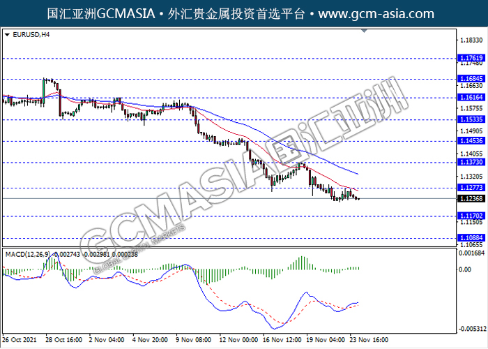 20211124 EURUSD-午间 by willy | Nov 24, 2021 | 欧元兑美元 | 0 comments EURUSD,H4: 欧美震荡盘整,目前测试前期压力。MACD动能略增,若突破可关注多头方向为主。上方关注1.1275压力和1.1375压力,下方关注1.1170支撑和1.1090支撑。